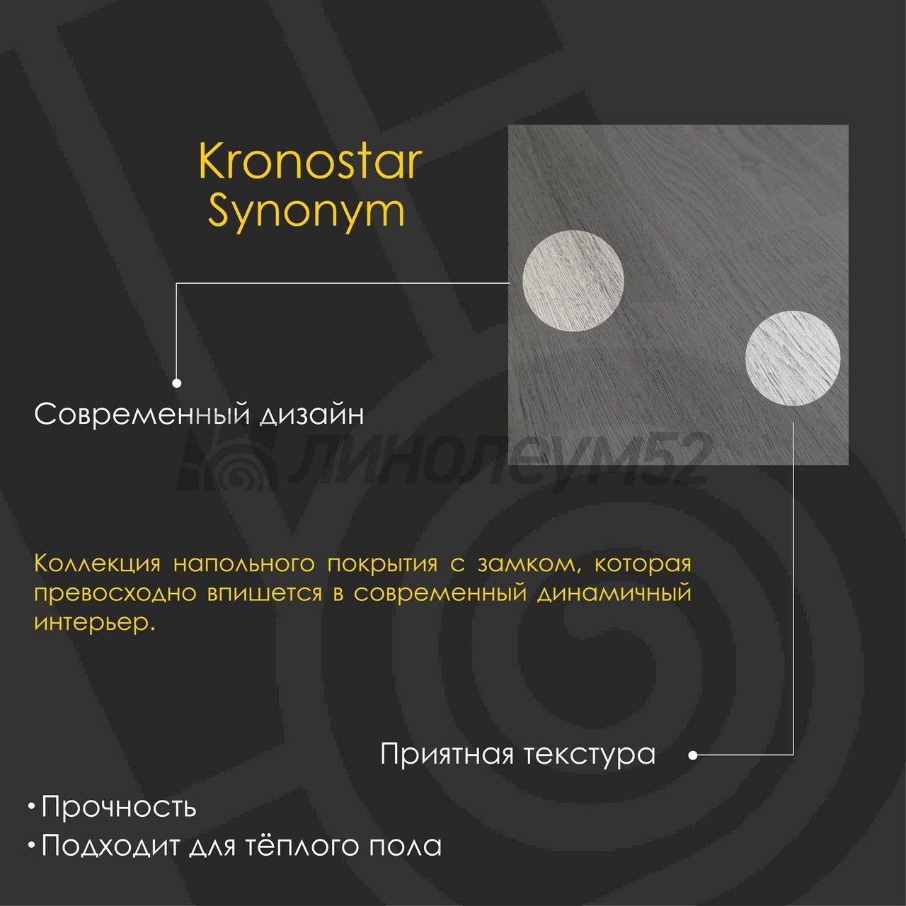 Ламинат Kronostar коллекция Synonym – напольное покрытие 33 класса износостойкости, в котором сочетаются экономичность и высокое качество. Поверхность ламината отлично передает текстуру натурального дерева. Благодаря системе Aquastop замок устойчив к воздействию влаги в течение 25 часов. Ламинат Kronostar Synonym будет служить верой и правдой, не теряя свой облик, Создавая уют и красоту, где каждый миг — твоя жизнь и стиль...