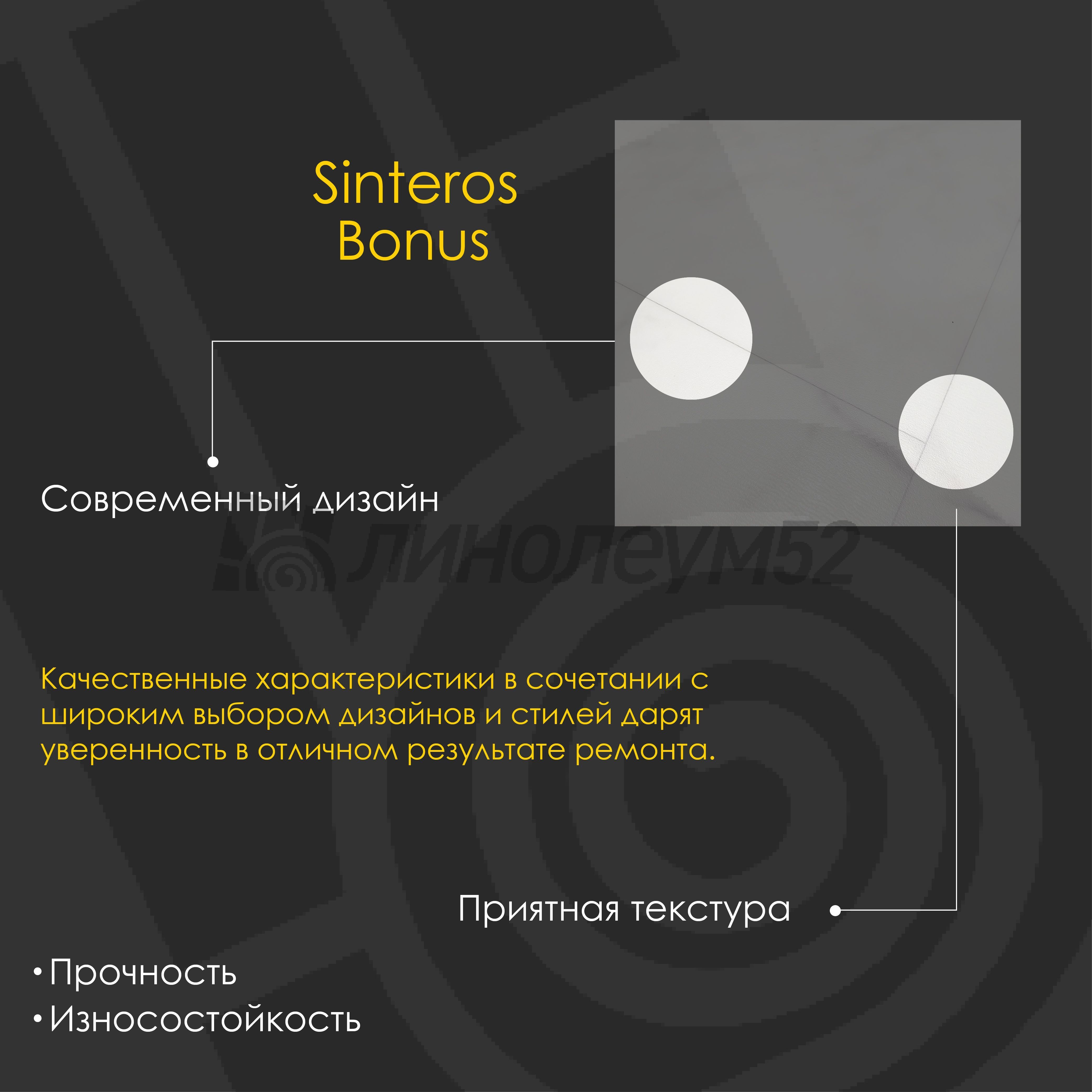 Бренд "SINTEROS" является одним из лидеров на рынке линолеума в России уже на протяжении многих лет. Такое стабильное положение бренд занимает благодаря объективным факторам, среди которых - постоянно совершенствующиеся технологии производства и эксплуатационные характеристики напольных покрытий. Ассортимент бренда "SINTEROS" включает линолеум, а также паркетную доску и ламинат популярных дизайнов. В 2015 году ПВХ-покрытия бренда "SINTEROS" стали обладателем Свидетельства о соответствии высшему уровню качества - "ЗОЛОТОЙ ЗНАК КАЧЕСТВА XXI ВЕКА". Получение такого свидетельства - это дополнительная оценка и подтверждение стремлений компании предлагать качественные, безопасные решения и быть ближе к нашим потребителям. Если у вас остались вопросы, то наши специалисты с радостью помогут найти ответы и примут любой вызов...