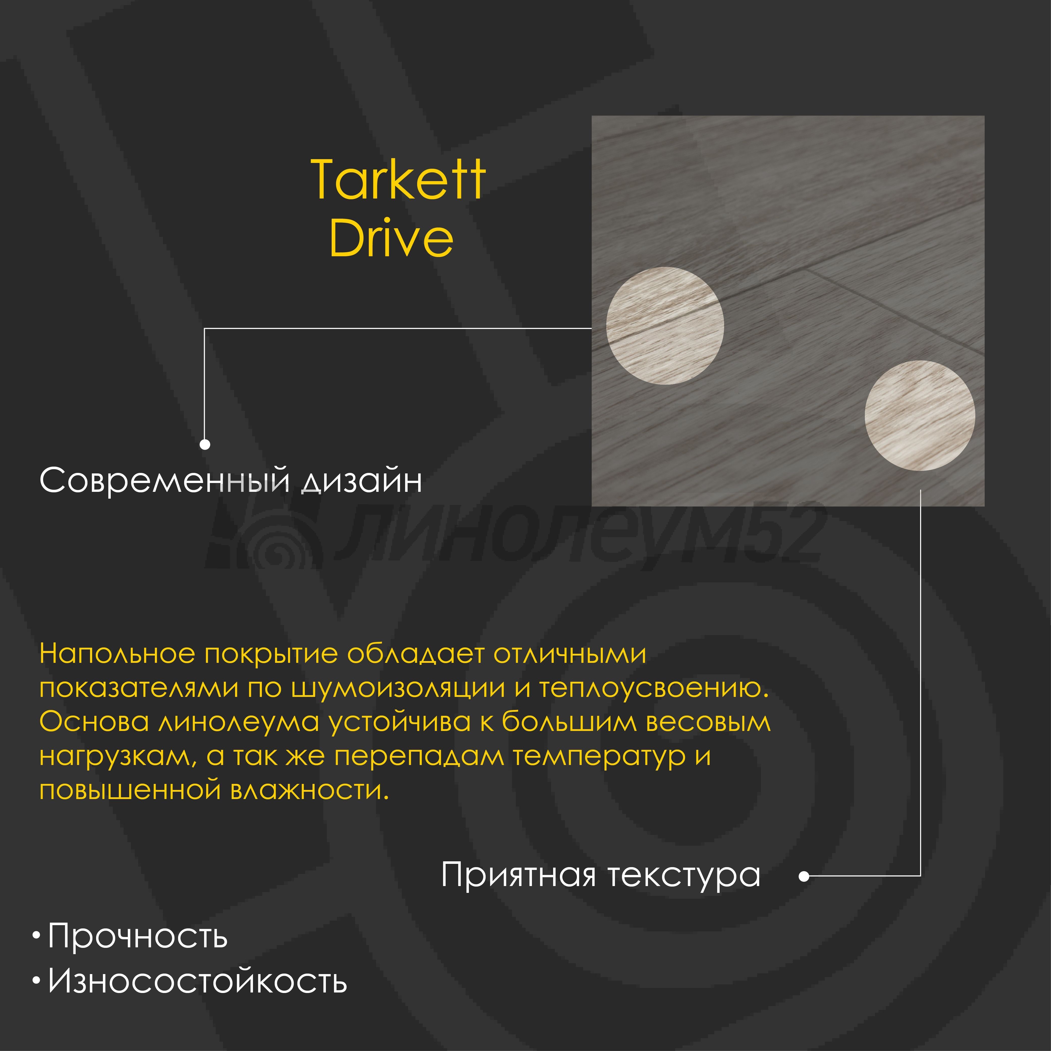 "DRIVE" - новая коллекция бытового линолеума от компании "TARKETT". Она гармонично сочетается с интерьерами различного стиля, дополняя их традиционными расцветками под натуральное дерево. Напольное покрытие обладает отличными показателями по шумоизоляции и теплоусвоению. Двойная основа линолеума "DRIVE устойчива к большим весовым нагрузкам, а ещё перепадам температур и повышенной влажности. Он не растягивается и не садится в процессе эксплуатации. Защитный лак "TITAN" значительно упрощает процесс уборки. Яркие эмоции и отличное качество уже в продаже. Если у вас ещё остались вопросы, то наши специалисты с радостью помогут найти ответы на каждый из них...