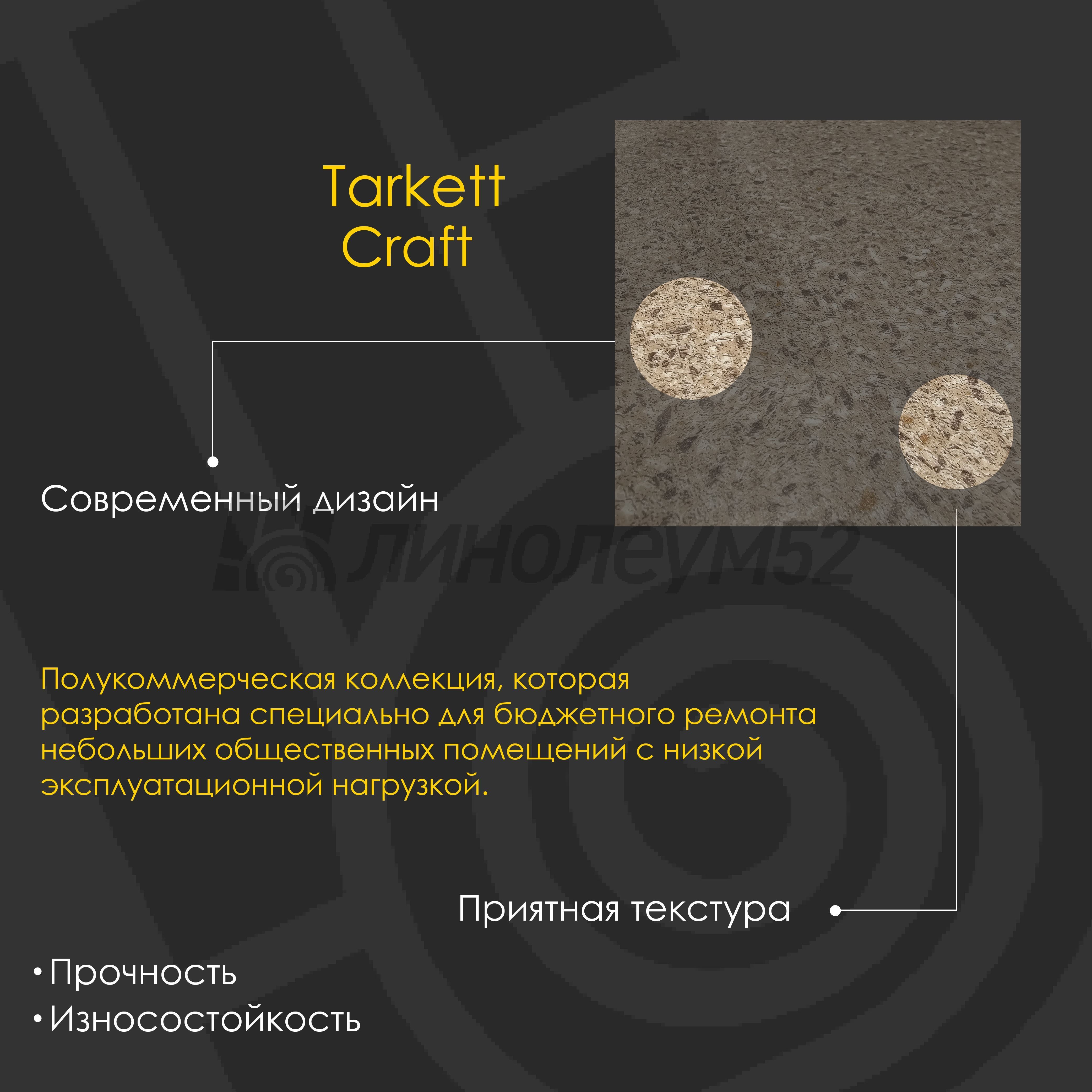 "CRAFT" - это основа из компактной пены в сочетании с самыми ходовыми оттенками сезона отныне пополнили ассортимент "TARKETT". Широкая линейка продуктов (ПВХ-покрытия, а ещё ламинат и паркет) и совершенный выбор дизайнов позволят создать индивидуальный стиль для каждого интерьера. "TARKETT" находится в постоянном сотрудничестве с архитекторами, проектировщиками и дизайнерами, а также управляющими компаниями, стремясь принести комфорт в разные помещения...