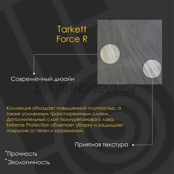 Уникальное сочетание высокой плотности и прочности с качественными универсальными дизайнами сделали "FORCE R" одним из самых популярных покрытий для дома и офиса. Нейтральная абстракция и прохладный на вид мрамор или по настоящему живое, тёплое дерево во всем многообразии расцветок коллекции позволяют создать свой собственный, уникальный интерьер, а защитный слой "EXTREME PTOTECTION" добавит спокойствие на долгие года. "FORCE" - воплощение силы для любых помещении...
