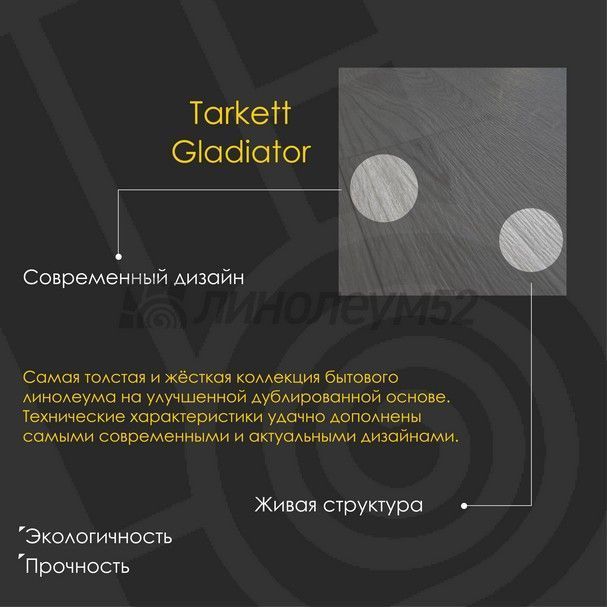"GLADIATOR" - это самая толстая и жёсткая коллекция бытового линолеума на улучшенной дублированной основе в ассортименте "TARKETT". Широкая линейка продуктов (ПВХ-покрытия, а ещё ламинат и паркет) и большим выбором дизайнов позволят создать индивидуальный стиль для каждого интерьера. "TARKETT" находится в постоянном сотрудничестве с архитекторами, проектировщиками и дизайнерами, а также управляющими компаниями, стремясь принести комфорт в любые помещения...