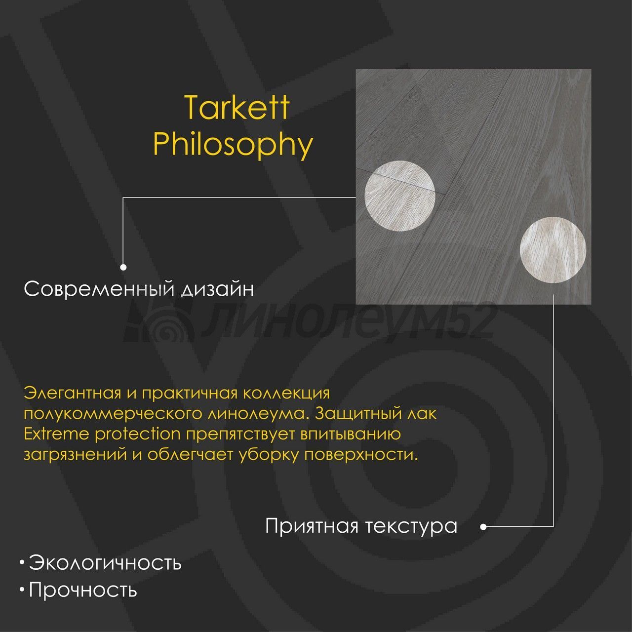 Новейшая коллекция от компании "TARKETT" уже представлена перед вашими глазами. Универсальная комбинация классов 23/32 в сочетании с защитным слоем "EXTREME PROTECTION" не оставит никого равнодушным. Большой спектр оттенков подходит для большинства интерьеров, а класс пожарной безопасности даёт гарантию до 15 лет (В3; РП2; Д3; Т3). Если вы хотите получить всё и сразу, то данная коллекция под названием "PHILOSOPHY" можно приобрести в нашем магазине по доступной цене. Если у вас остались вопросы, то наши специалисты с радостью помогут найти ответы на каждый из них...