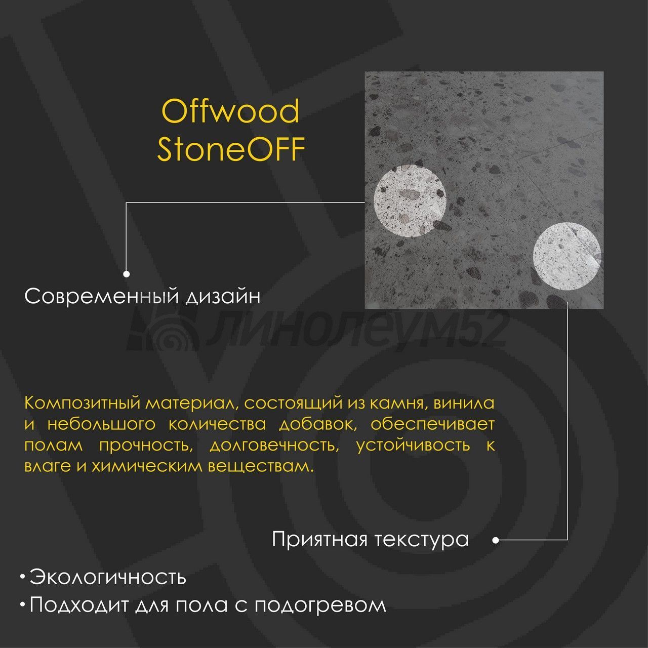 OFFWOOD StoneOFF — коллекция напольных SPC покрытий. Полимерные полы характеризуются прочностью, долговечностью, устойчивостью к воздействию влаги и химических веществ. Напольные покрытия предназначены для укладки как в коммерческих помещениях с высокой проходимостью, так и в жилых пространствах. Полы имеют класс пожарной опасности КМ2, что подтверждает их безопасность и экологичность. Структура полов имитирует натуральный камень. Благодаря цифровой печати, дизайн верхнего слоя выглядит реалистично и эстетично, добавляя интерьеру уникальность. Защитный слой толщиной 0,5 мм снижает вероятность образования царапин, потертостей и других механических повреждений, значительно продлевая срок службы пола. Покрытия доступны в светлых и темных тонах, что позволяет легко подобрать их под дизайн помещения.