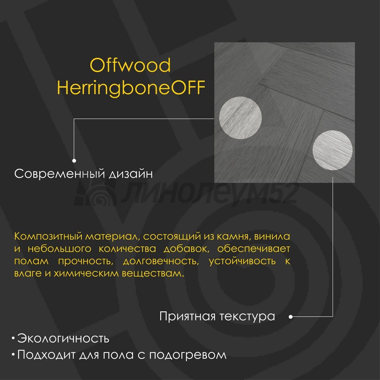 Уникальные свойства: Подходит для пола с подогревом +27°С / Продажа товара отпускается в упаковках / Уникальный стиль / Экологичность