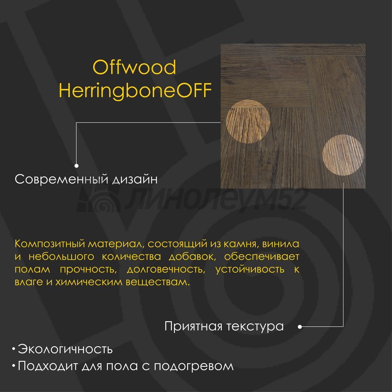 Уникальные свойства: Подходит для пола с подогревом +27°С / Продажа товара отпускается в упаковках / Уникальный стиль / Экологичность