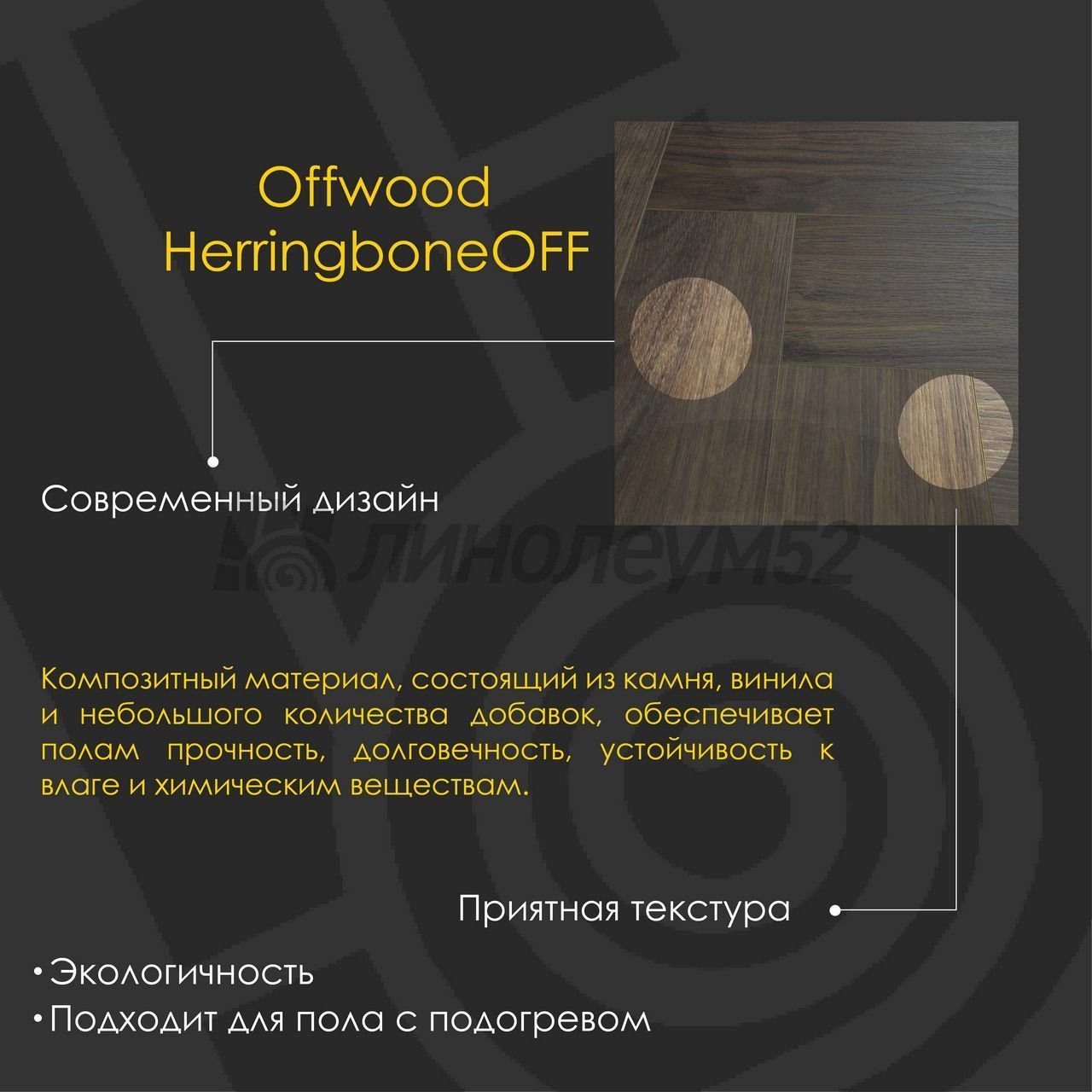 Уникальные свойства: Подходит для пола с подогревом +27°С / Продажа товара отпускается в упаковках / Уникальный стиль / Экологичность